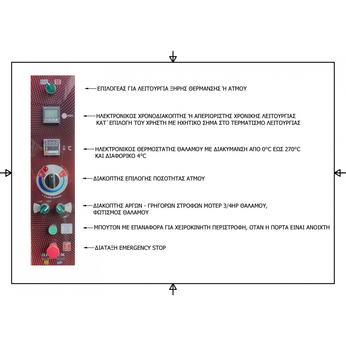 • Διακόπτης φωτισμού του θαλάμου, με δύο φωτιστικα LED, κατάλληλα για υψηλές θερμοκρασίες και στεγανοποίηση από ατμούς